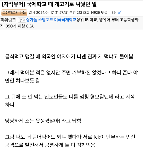국제학교 때 ㄱ고기로 제대로 싸웠던 썰 국제학교 때 ㄱ고기로 제대로 싸웠던 썰 ADVERTISEMENT ADVERTISEMENT [저작권자 NEWSNACK/ 무단복사, 무단전재 및 재배포 금지 (위반 시 법적조치)]