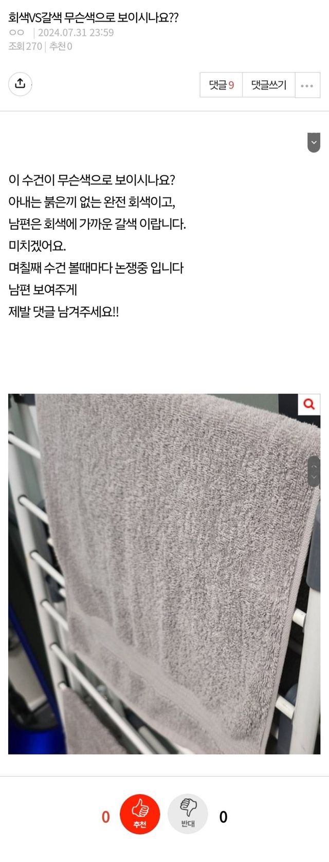 댓글 터지고있는중인 수건색 논쟁 ㄷㄷ 댓글 터지고있는중인 수건색 논쟁 ㄷㄷ ADVERTISEMENT ADVERTISEMENT 낮잠을 좀 잣더니 웃긴걸 봄 ㅋㅋ 부부는 별거 가지고도 싸우는구만 ㅋㅋㅋ 개붕이들은 이거 무슨색으로 보임ㅋ 캡쳐 말고 원글 다운로드 받아옴ㅋㅋ ADVERTISEMENT 포토샵으로 찍어보면 좀 다를수도잇겟지만 우선 폰으로 찍어보니까 남편말에 좀 더 가까우려나 ADVERTISEMENT [저작권자 NEWSNACK/ 무단복사, 무단전재 및 재배포 금지 (위반 시 법적조치)]