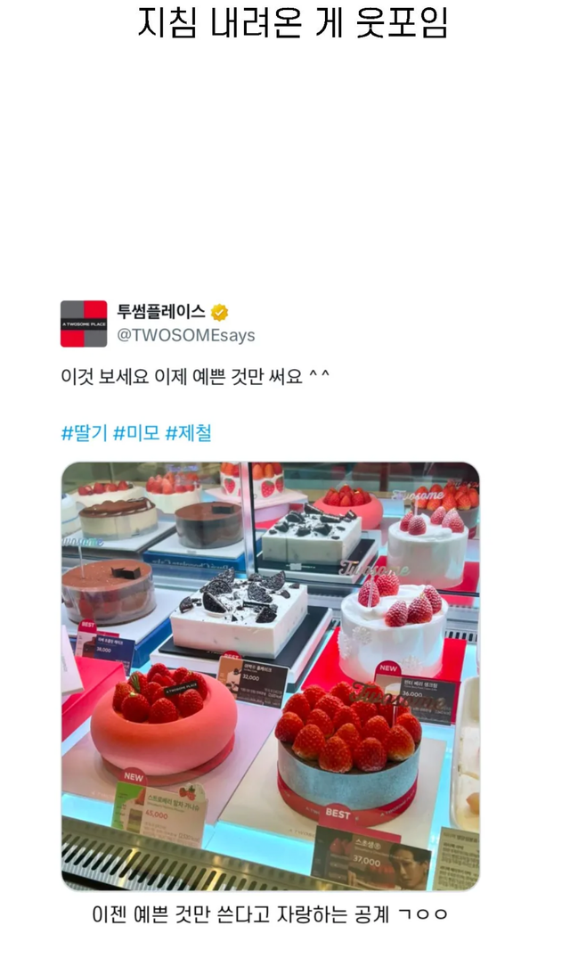 딸기가 너무 우람해서 놀림거리 되버린 투썸의 최후결말… 딸기가 너무 우람해서 놀림거리 되버린 투썸의 최후결말… ADVERTISEMENT ADVERTISEMENT ADVERTISEMENT [저작권자 NEWSNACK/ 무단복사, 무단전재 및 재배포 금지 (위반 시 법적조치)]