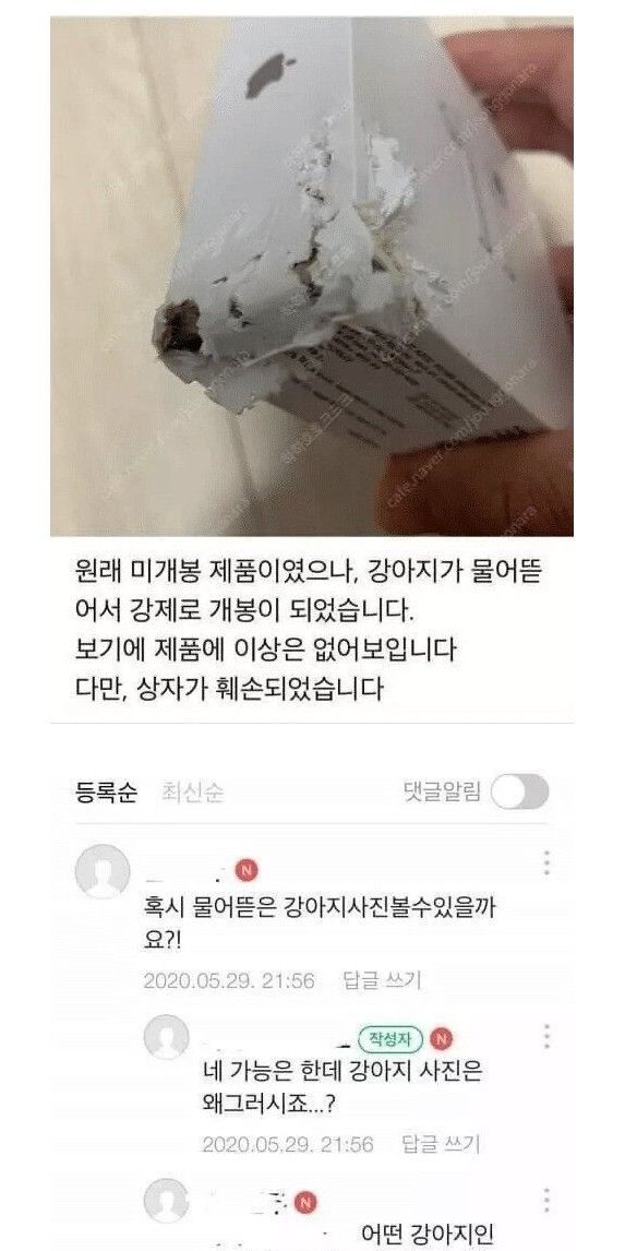 미개봉인데 강아지가 물어뜯었어요 미개봉인데 강아지가 물어뜯었어요 ADVERTISEMENT ADVERTISEMENT ADVERTISEMENT [저작권자 NEWSNACK/ 무단복사, 무단전재 및 재배포 금지 (위반 시 법적조치)]