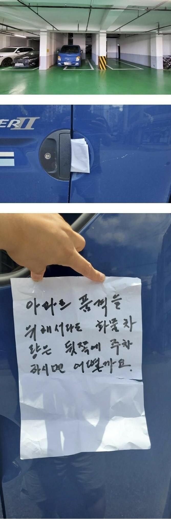 아파트에 포터 주차했더니 붙은 쪽지