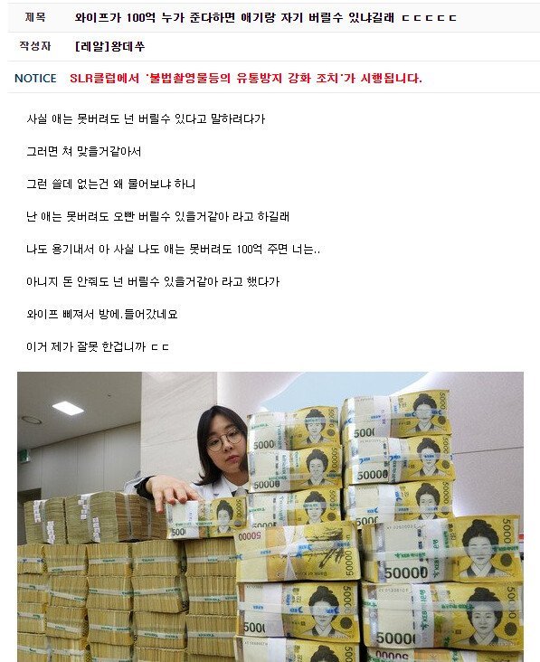 와이프가 100억 누가 준다하면 애기랑 자기 버릴 수 있냐길래