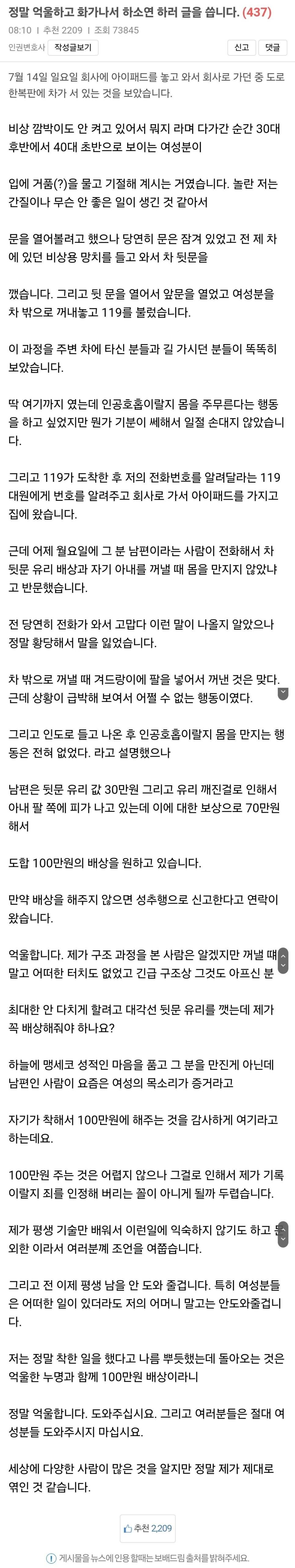 차에서 ㄱ절한 아줌마 구했더니 돈을 요구하네요… 차에서 ㄱ절한 아줌마 구했더니 돈을 요구하네요… ADVERTISEMENT ADVERTISEMENT [저작권자 NEWSNACK/ 무단복사, 무단전재 및 재배포 금지 (위반 시 법적조치)]