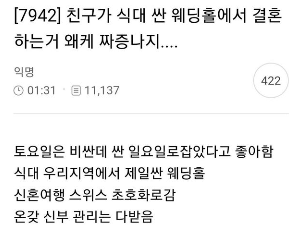 친구가 식대 싼 웨딩홀에서 결혼하는 거 왜케 짜증 나지.. 친구가 식대 싼 웨딩홀에서 결혼하는 거 왜케 짜증 나지.. ADVERTISEMENT ADVERTISEMENT ADVERTISEMENT ADVERTISEMENT
