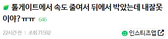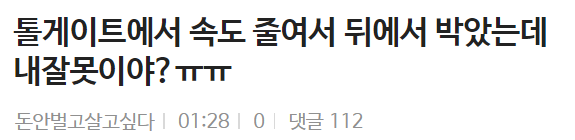톨게이트에서 속도 줄여서 뒤에서 박았는데 내잘못이야?ㅠㅠ 톨게이트에서 속도 줄여서 뒤에서 박았는데 내잘못이야?ㅠㅠ ADVERTISEMENT ADVERTISEMENT ADVERTISEMENT ADVERTISEMENT ADVERTISEMENT [저작권자 NEWSNACK/ 무단복사, 무단전재 및 재배포 금지 (위반 시 법적조치)]