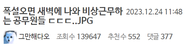 폭설오면 새벽에 나와 비상근무하는 공무원들 ㄷㄷ 폭설오면 새벽에 나와 비상근무하는 공무원들 ㄷㄷ ADVERTISEMENT ADVERTISEMENT ADVERTISEMENT ADVERTISEMENT [저작권자 NEWSNACK/ 무단복사, 무단전재 및 재배포 금지 (위반 시 법적조치)]