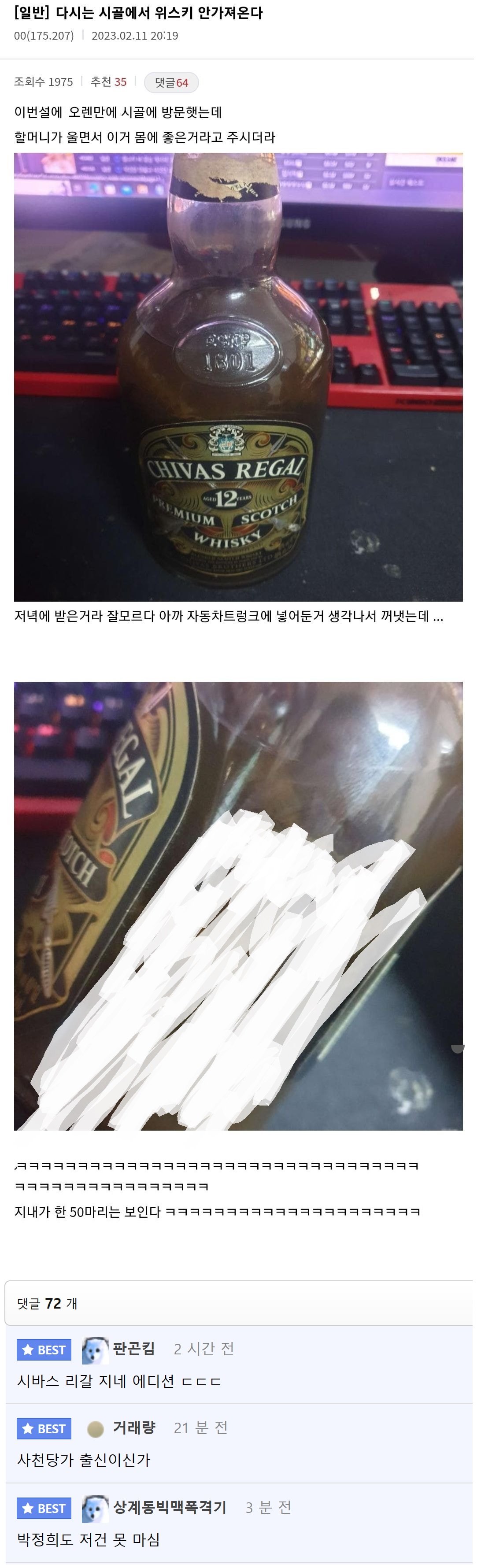 할머니가 챙겨준 위스키의 정체 할머니가 챙겨준 위스키의 정체 ADVERTISEMENT ADVERTISEMENT [저작권자 NEWSNACK/ 무단복사, 무단전재 및 재배포 금지 (위반 시 법적조치)]