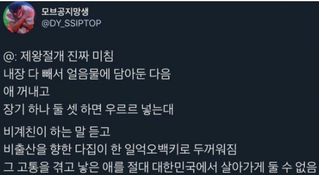 “@ : 제왕절개 진짜 미침. 내장 다 빼서 얼음물에 담아둔 다음 애 꺼내고 장기 하나 둘 셋 하면 우르르 넣는대. 비계친이 하는 말 듣고 비출산을 향한 다짐이 한 일억오백키로 두꺼워짐. 그 고통을 겪고 낳은 애를 절대 대한민국에서 살아가게 둘 수 없음”