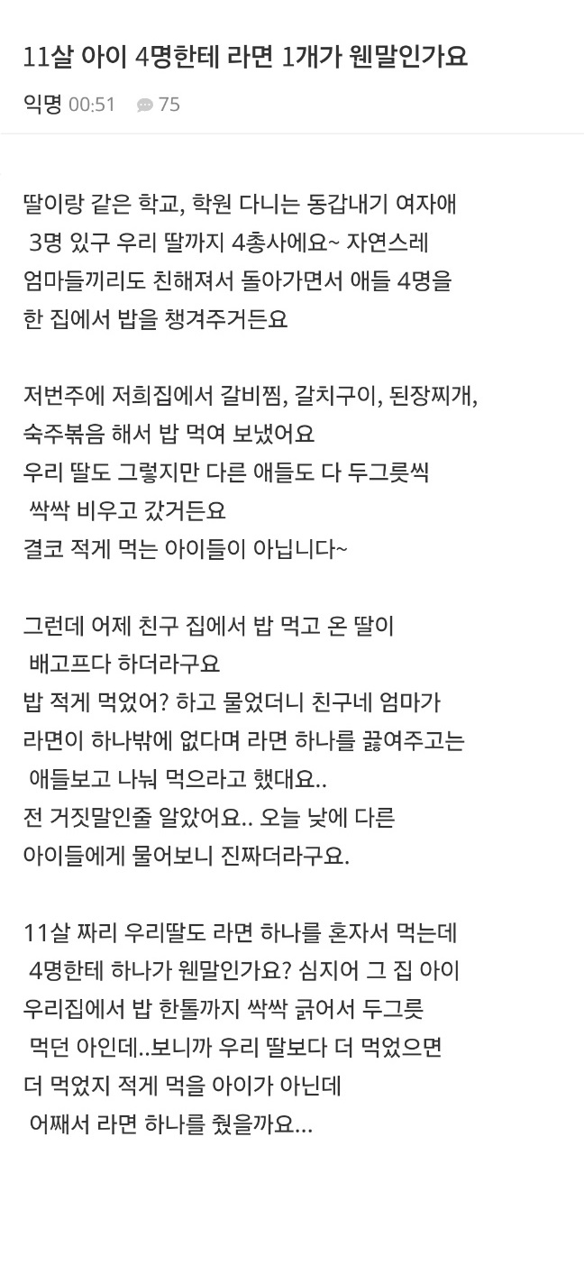 11살 아이 4명한테 라면 1개가 웬말인가요 11살 아이 4명한테 라면 1개가 웬말인가요 ADVERTISEMENT ADVERTISEMENT [저작권자 NEWSNACK/ 무단복사, 무단전재 및 재배포 금지 (위반 시 법적조치)]