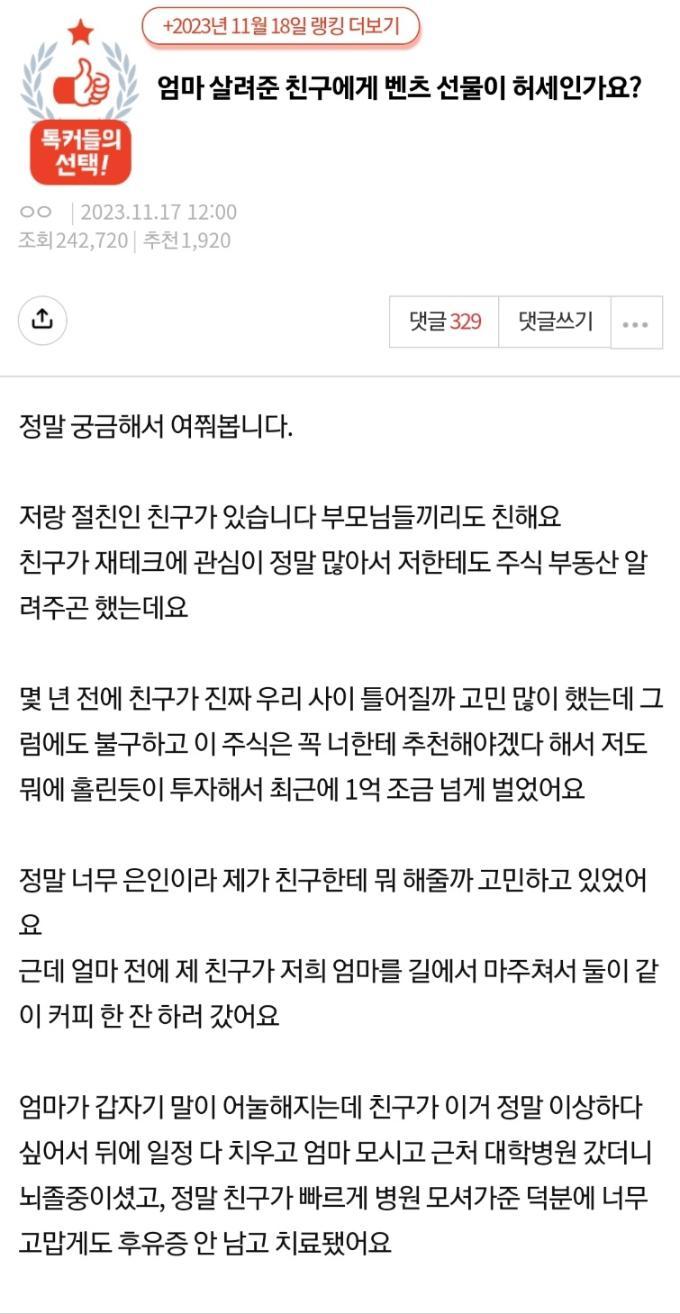 엄마 살려준 친구에게 벤츠 선물이 허세인가요? 엄마 살려준 친구에게 벤츠 선물이 허세인가요? ADVERTISEMENT ADVERTISEMENT ADVERTISEMENT [저작권자 NEWSNACK/ 무단복사, 무단전재 및 재배포 금지 (위반 시 법적조치)]