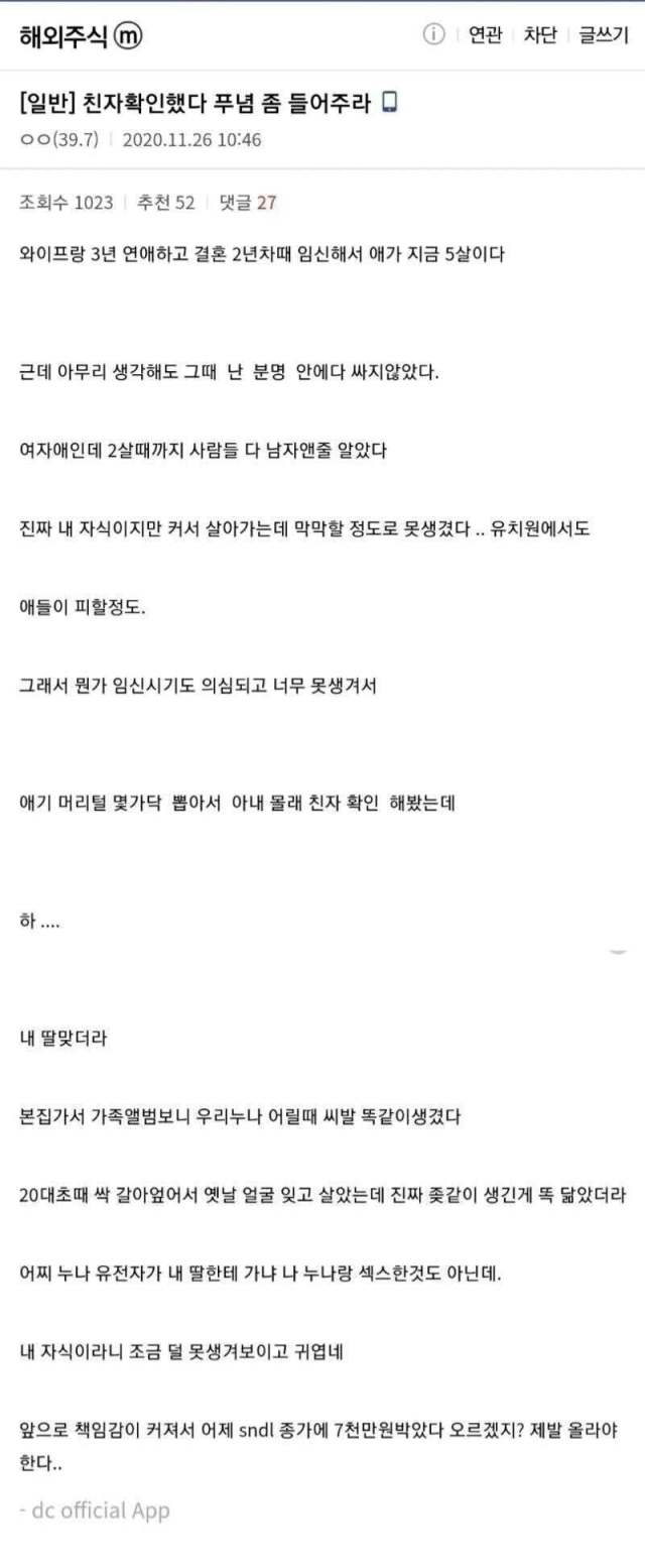 아내 몰래 5살 딸 친자 확인한 결과 아내 몰래 5살 딸 친자 확인한 결과 ADVERTISEMENT ADVERTISEMENT [저작권자 NEWSNACK/ 무단복사, 무단전재 및 재배포 금지 (위반 시 법적조치)]